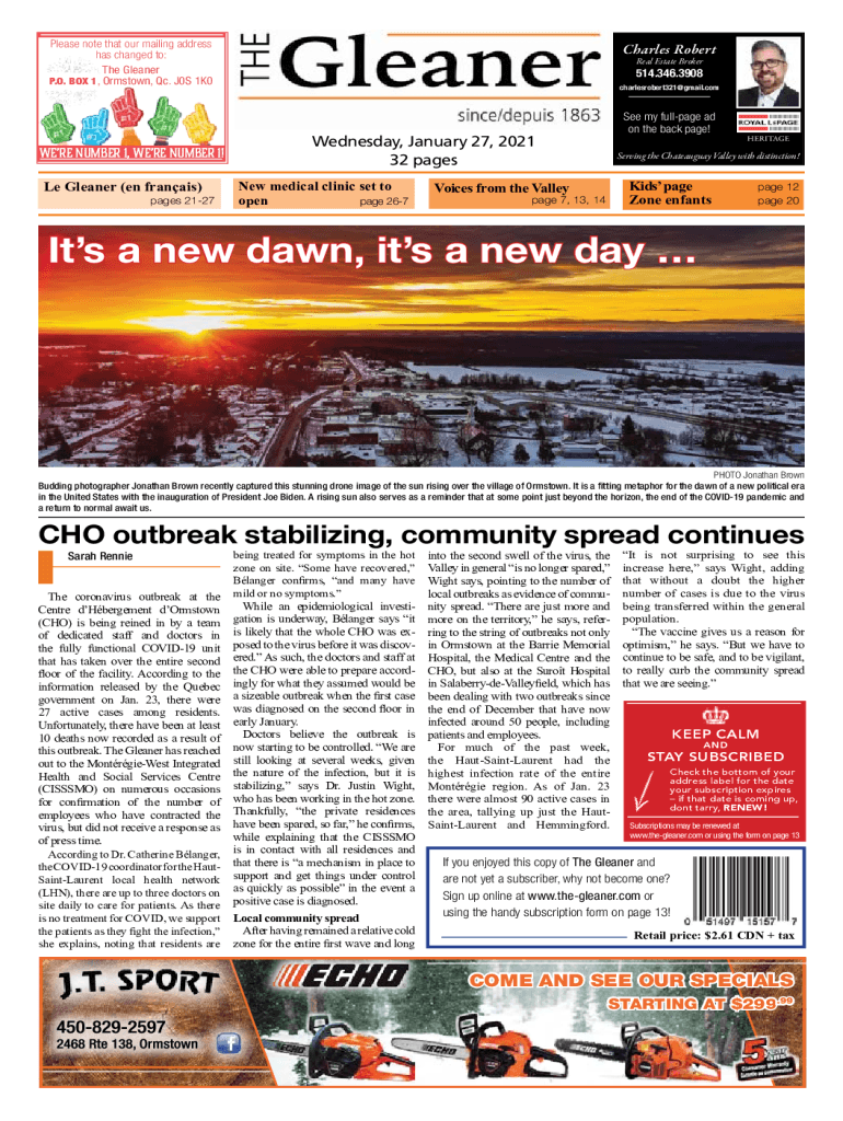 Please note that our mailing address has changed to: The Gleaner P.O. BOX 1, Hometown, QC. J0S 1K0Were number 1, where number 1! Le Gleaner (en Francis)pages 2127Charles Robert Real Estate Broker514.346.3908
