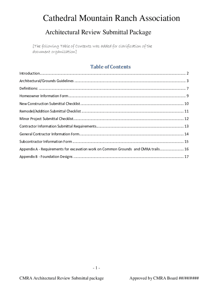 Cathedral Mountain Ranch Association Architectural Review Submittal Package [The following Table of Contents was added for clarification of the document organization]Table of Contents Introduction...................................................................................................................................................
