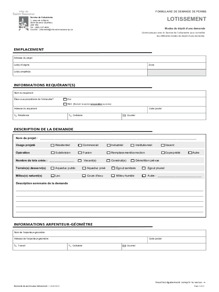 FORMULA IRE DE DEMAND DE PERMISLOTISSEMENTService de urbanism 1, place DE la Masai SaintSauveur (Quebec) J0R 1R6 Tl : (450) 2274633 Courier : urbanisme@ville.saintsauveur.qc.caModes de dpt dune demand