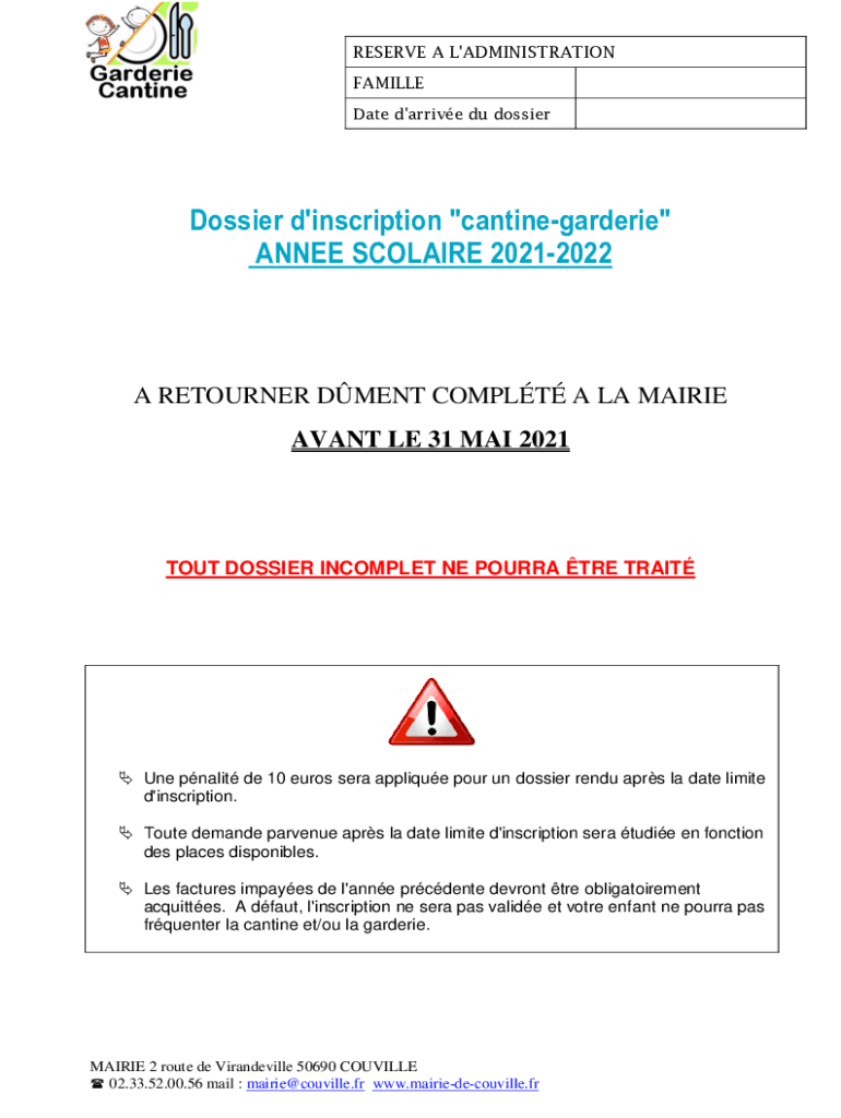 RESERVE A L\'ADMINISTRATIONCAMILLEE Date d\'arrived dossierDossier d\'inscription \'cantinegarderiANNEACLAIRELAIRE 20212RETURNERUDENTDCOMPLYOÀ la MARIEASAVANTAVANT LE 31 MAI 2021TOUT DOSINCOMPLETEMPLEPOUROURRA