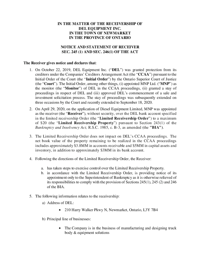 IN THE MATTER OF THE RECEIVERSHIP OF DEL EQUIPMENT INC. IN THE TOWN OF NEWMARKET IN THE PROVINCE OF ONTARIO NOTICE AND STATEMENT OF RECEIVER SEC. 245 (1) AND SEC. 246(1) OF THE ACT The Receiver gives