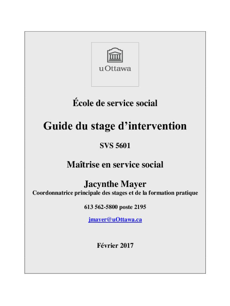 Cole de service socialite Du staged intervention VS 5601Matrise en service social Jayne Mayer Coordonnatrice principal DES stages et de la formation critique 613 5625800 post 2195 jmayer@uOttawa.caFvrier