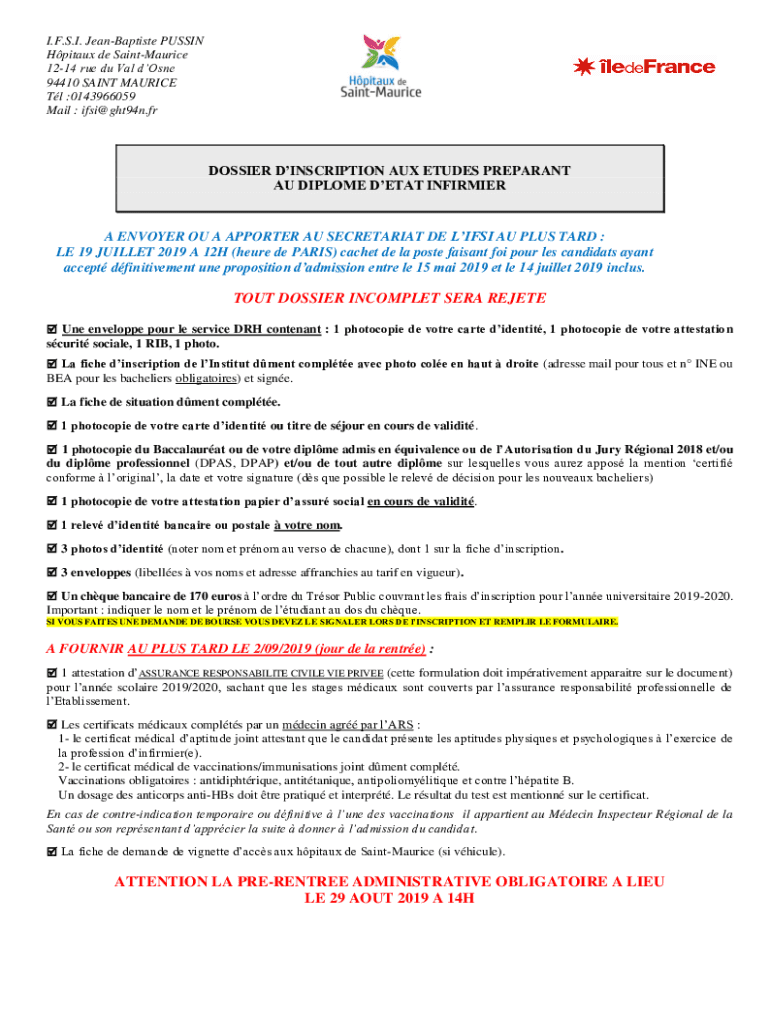 I.F.S.I. Jean Baptiste POUSSIN Hiatus de SaintMaurice 1214 rue Du Val done 94410 SAINT MAURICE Tl :0143966059 Mail : ifsi@ght94n.frDOSSIER INSCRIPTION AUX Études PREPARING AU DIPLOMA DET AT INFIRMARY