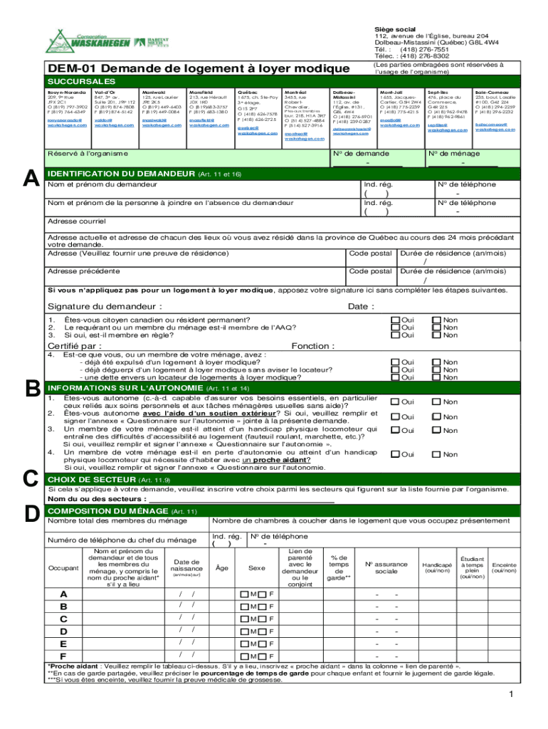 Side social 112, avenue de Louise, bureau 204 DolbeauMistassini (Quebec) G8L 4W4 Tl. : (418) 2767551 Alec. : (418) 2768302 (Les parties embraces sent serves usage DE organism)DEM01 Demand DE movement