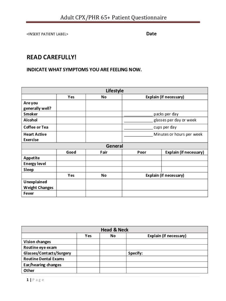 Adult CPU/PHR 65+ Patient QuestionnaireReinsertT PATIENTLABELEDD CAREFULLY! INDICATE WHAT SYMPTOMS YOU ARE FEELING NOW Lifestyle YesNoExplain (if necessary)Are you generally well? Smoker Alcohol___