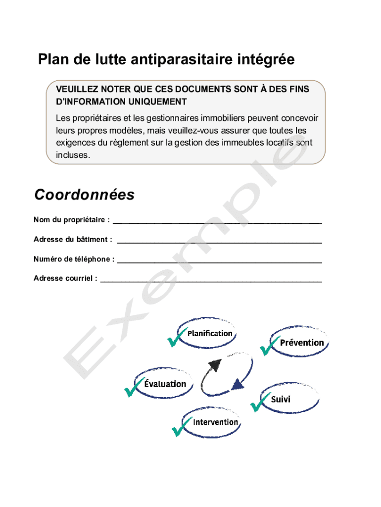 Le plan de lutte antiparasitaire doit inclure des informations sur les types de parasites visés, les méthodes de traitement utilisées, les fréquences d'intervention, etc.