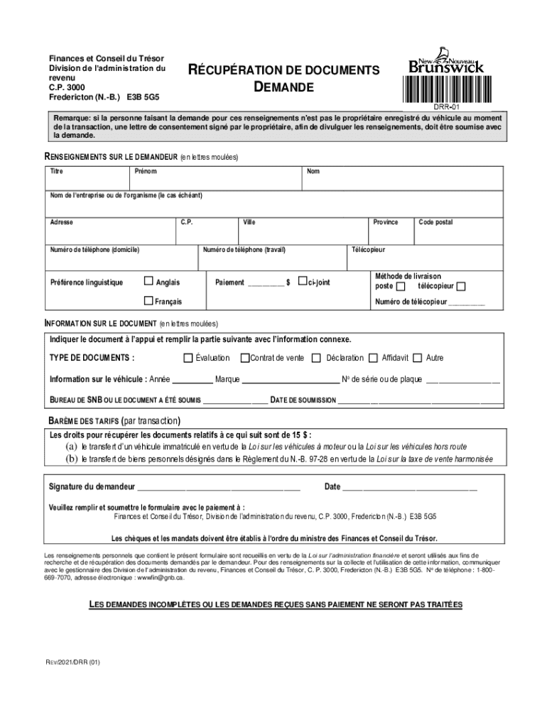 Finances et Conrail du Prior Division DE administration Du revenue C.P. 3000 Fredericton (N.B.) E3B 5G5RCUPRATION DE DOCUMENTS DEMANDERemarque: is la personnel faint la demand pour CES restatements