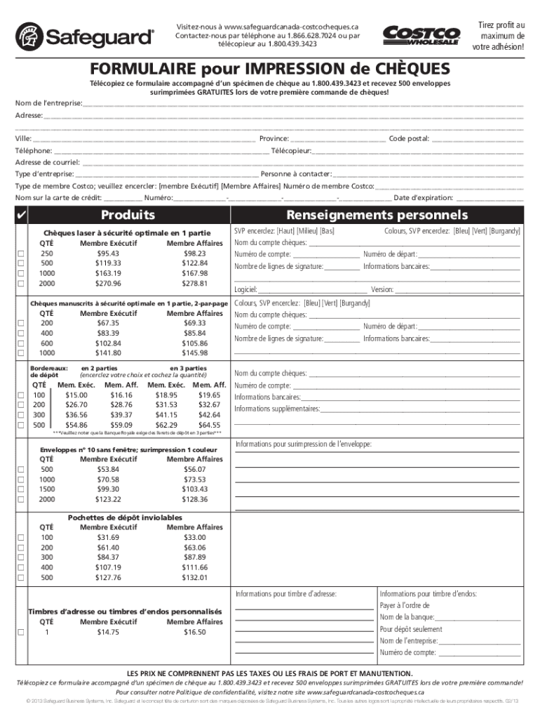 Tire profit Au maximum DE vote adhesion! Visiteznous www.safeguardcanadacostcocheques.ca Contacteznous par phone AU 1.866.628.7024 of par copier AU 1.800.439.3423FORMULAIRE pour IMPRESSION de CHQUES