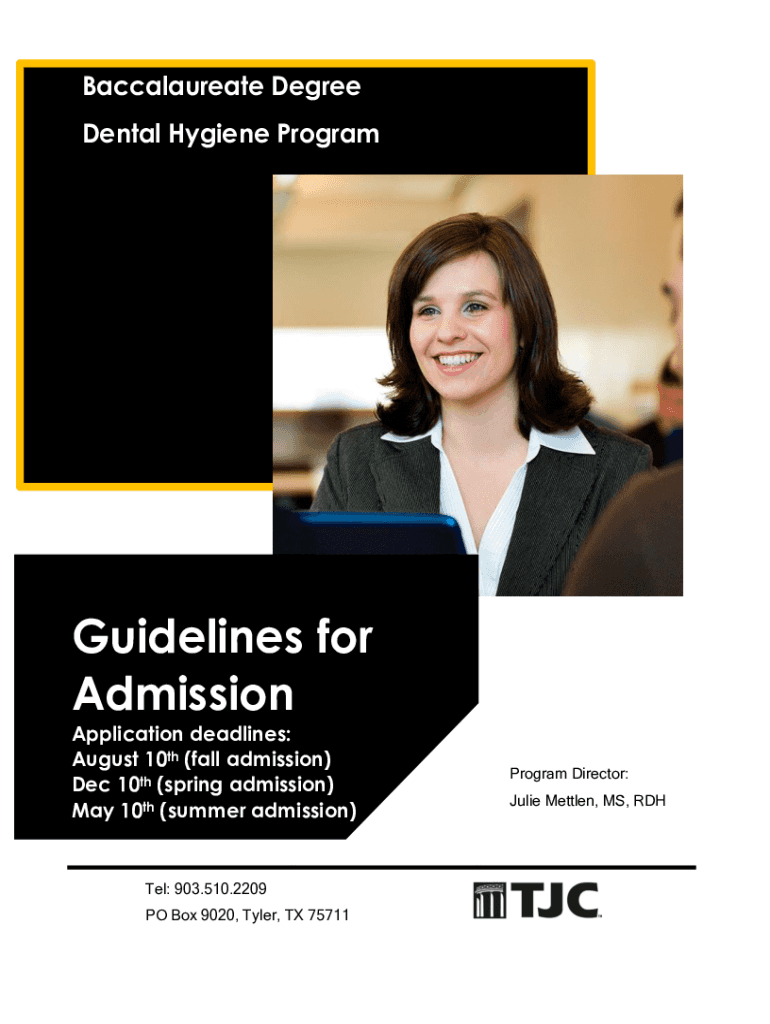 Baccalaureate Degree Dental Hygiene ProgramGuidelines for Admission Application deadlines: August 10th (fall admission) Dec 10th (spring admission) May 10th (summer admission)Tel: 903.510.2209 PO