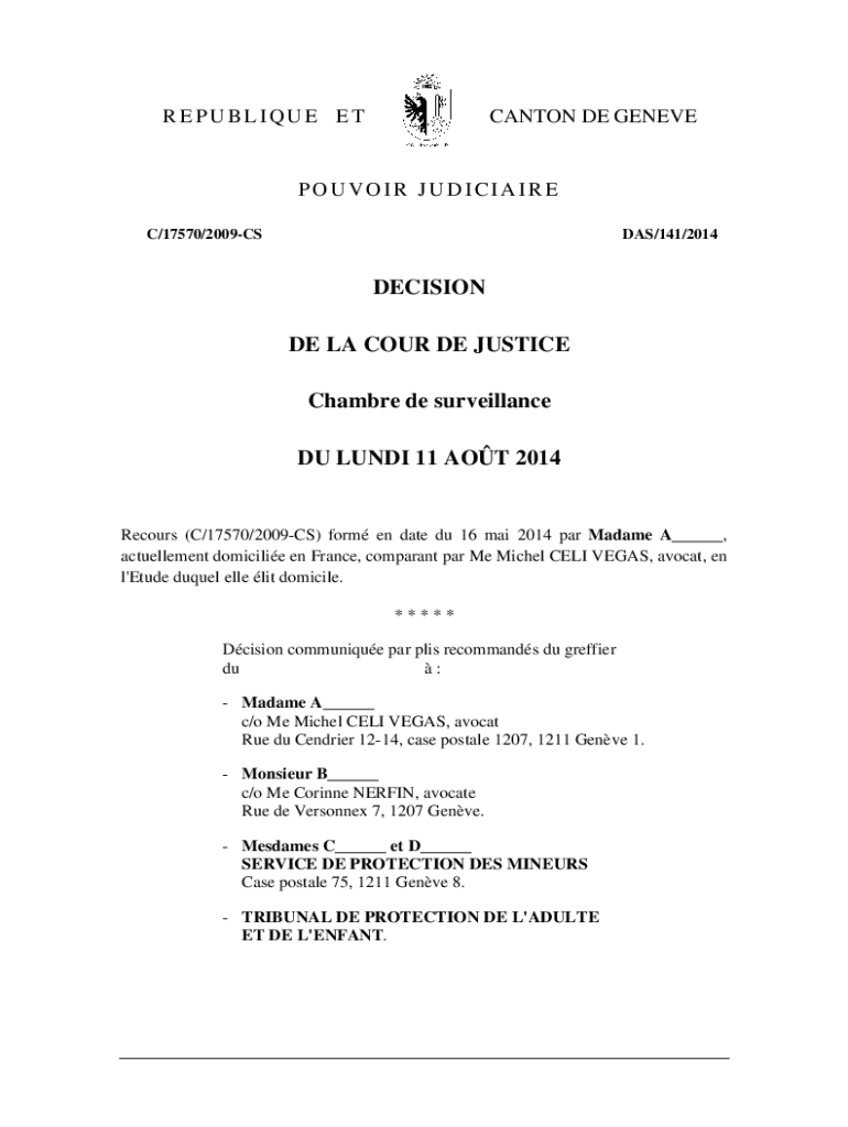 REPUBLICAN CANTON DE GENEVEPOUVOIR JUDICIARY C/17570/2009CSDAS/141/2014DECISION DE LAC OUR DE JUSTICE Chamber DE surveillance DU LUNDY 11 AOT 2014Recours (C/17570/2009CS) form en date Du 16 Mai 2014