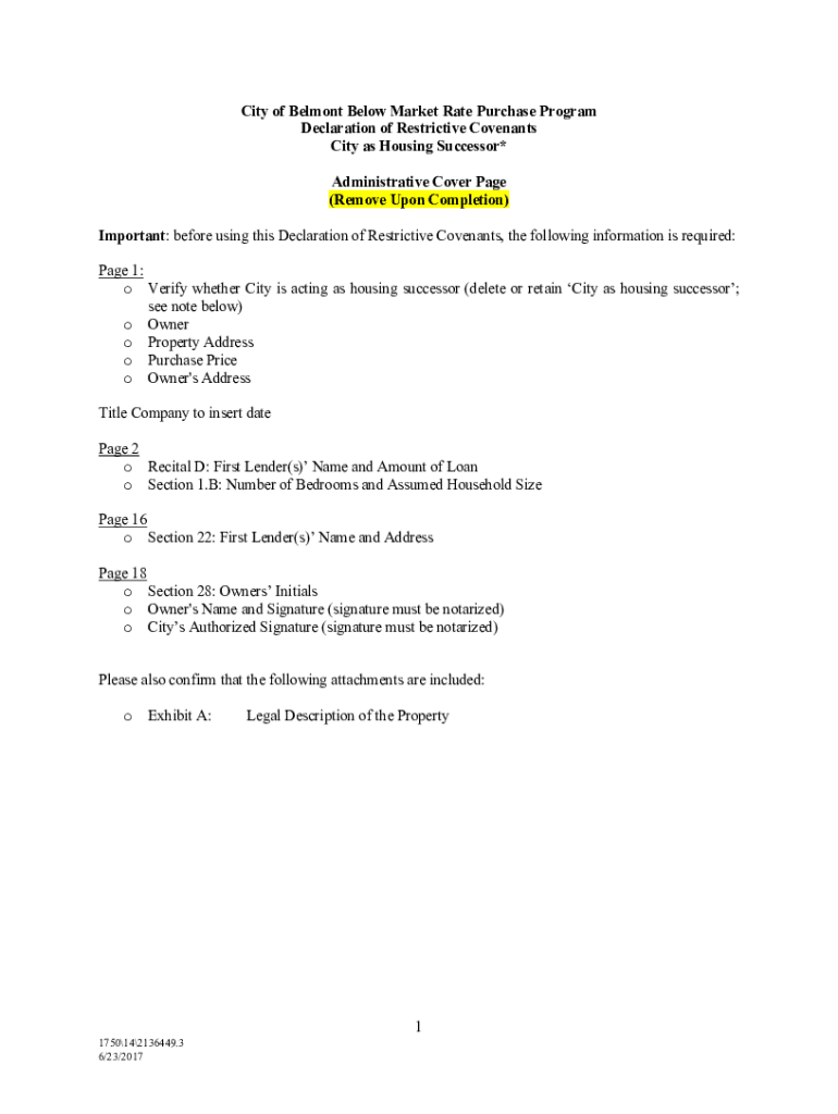 City of Belmont Below Market Rate Purchase Program Declaration of Restrictive Covenants City as Housing Successor* Administrative Cover Page (Remove Upon Completion) Important: before using this Declaration
