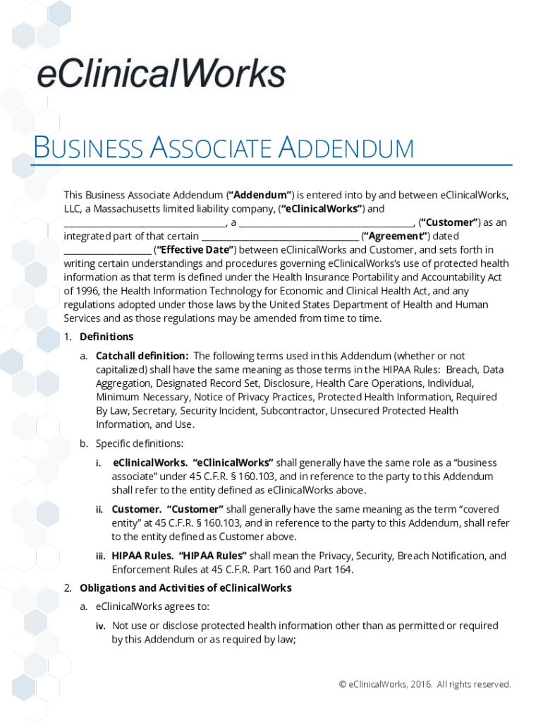 BUSINESS ASSOCIATE ADDENDUM This Business Associate Addendum (Addendum) is entered into by and between eClinicalWorks, LLC, a Massachusetts limited liability company, (eClinicalWorks) and ___, a ___,