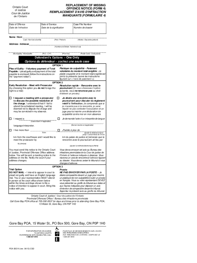 REPLACEMENT OF MISSING Offense NOTICE (FORM 4) REPLACEMENT D\'AVIS D\'INFRACTIOMANHUNTSTSFORMULA IRENE 4)Ontario Court of JusticFourur de Justice Ontario Date offensive Date de linfractionDate of