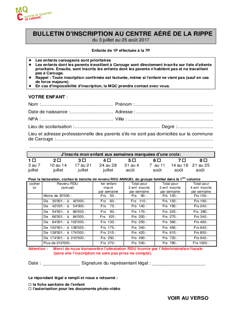 BULLETIN D\'INSCRIPTION AU Center DE LA RIPE Du 3 bullet AU 25 AOT 2017 Infants de 1P effect la 7P Les infants carousels sent priorities Les infants don't LES parents travail lent Carouse sent divestment