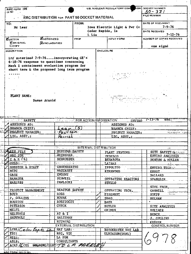 NRC(276)FORMING. S. NUCLEAR REGULATORY COM195i RC DISTRIBUTIONAL 50 DOCKET MATERIALFORFILE NUMBERFROM:TO:DATE OF DOCUMENT Iowa Electric Light & PWR Co Cedar Rapids, Iamb LearLftLETTER IORIGINAL7976