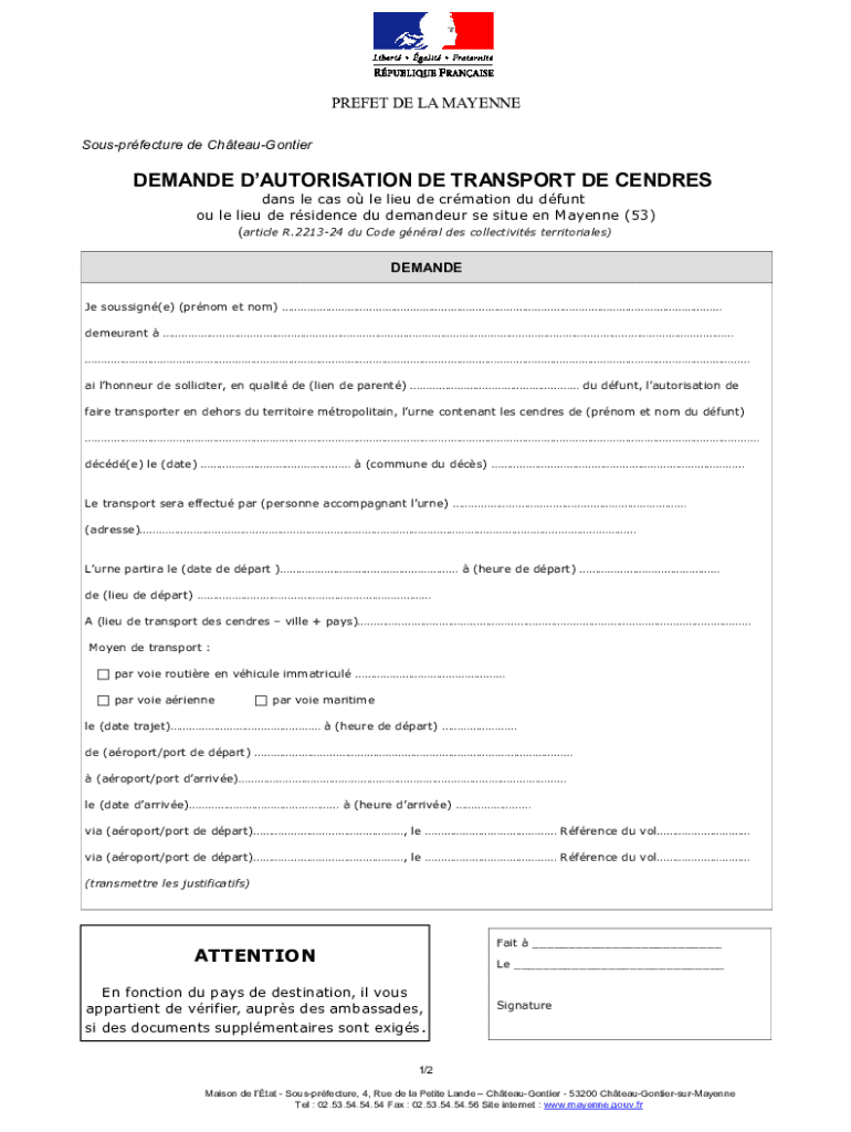 Get the free formulaire transport de corps.pdf - Prfecture de la Mayenne