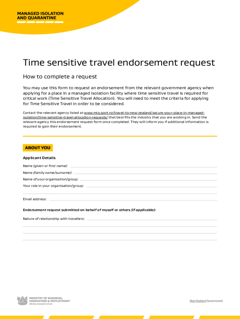 Time sensitive travel endorsement request How to complete a request You may use this form to request an endorsement from the relevant government agency when applying for a place in a managed isolation