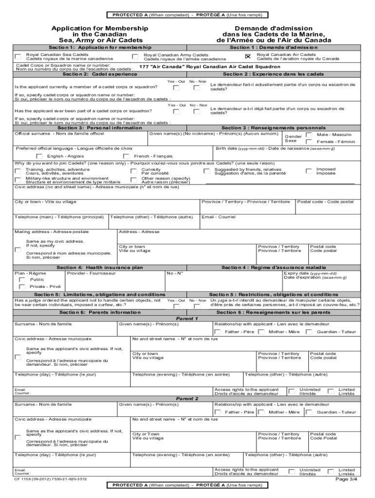 PROTECTED A (When completed) PRONG A (One foil temple)Application for Membership in the Canadian Sea, Army or Air CadetsDemande d\'admission days LES Cadets de la Marine, de l\'Are of de l\'Air du