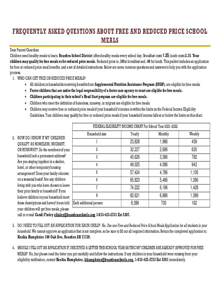 FREQUENTLY ASKED QUESTIONS ABOUT FREE AND REDUCED PRICE SCHOOL MEALS Dear Parent/Guardian: Children need healthy meals to learn. Bearded School District offers healthy meals every school day. Breakfast