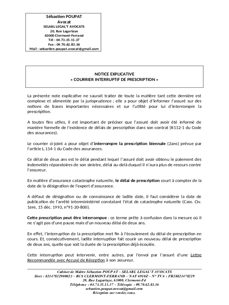 Based POUP AT Advocate SELARL LEGAL AVO CATS 20, Rue Lagarlaye 63000 Clermont-Ferrand Tl : 04.73.35.11.37 Fax : 09.70.62.83.36 Mail : sebasen.poupat.avocat@gmail.comNOTICE EXPLOITATIVE COURIER INTERRUPT