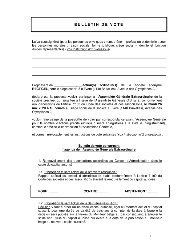 BULLETIN DE VOTE Le/La sous sign(e) (pour LES personnel physiques : not, prom, profession ET domicile ; pour LES personnel morals : raisin social, form critique, side social + identity ET function