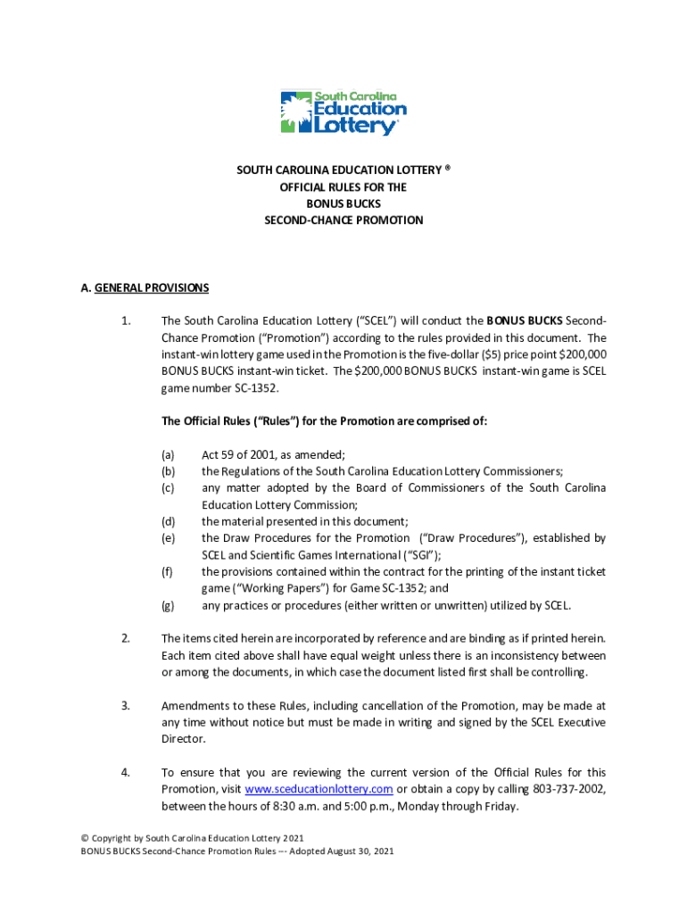 SOUTH CAROLINA EDUCATION LOTTERY OFFICIAL RULES FOR THE BONUS BUCKS SECONDHAND PROMOTION. GENERAL PROVISIONS 1. The South Carolina Education Lottery (CEL) will conduct the BONUS BUCKS Second Chance