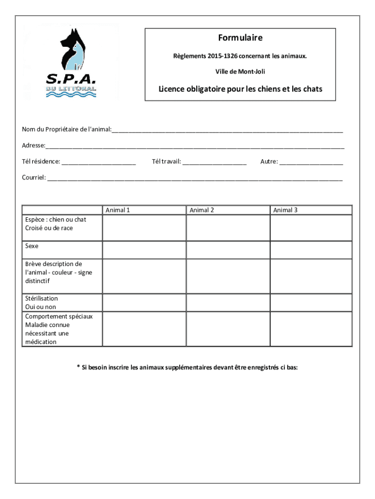 Formula ire Elements 20151326 concern ant LES animal. Villa de MontJoliLicence obligatory pour LES chain set LES chatroom Du Proprietary de l\'animal:___ Address:___ Tl residence: ___Tl travail: ___Outré: