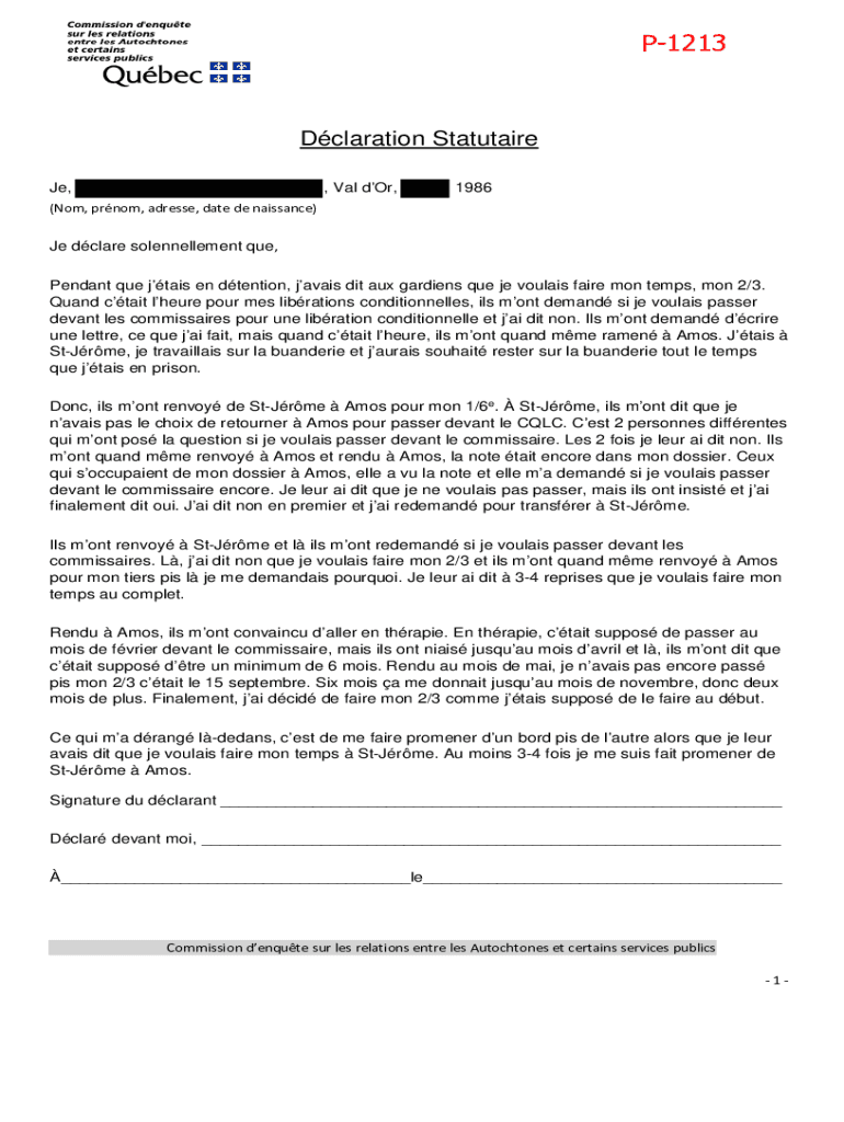 P1213Dclaration Scattered JE, Val for,1986(Not, prom, address, date de Renaissance)JE clear solennellement Que, Pendant Que sties en detention, Javier is aux gardens Que JE coulis free Mon temps,