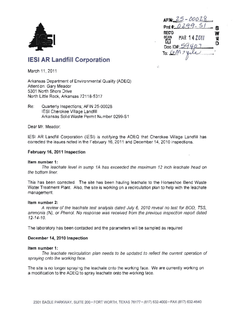 AJ;IN\' 25 goal. PMT#;IJ2. Q1REC\'OSI IMSI AR Landfill CorporationWMAR 14 Widowed#\' S To:. If Jo., March 11, 2011, Arkansas Department of Environmental Quality (ADEN) Attention: Gary Meadow 5301