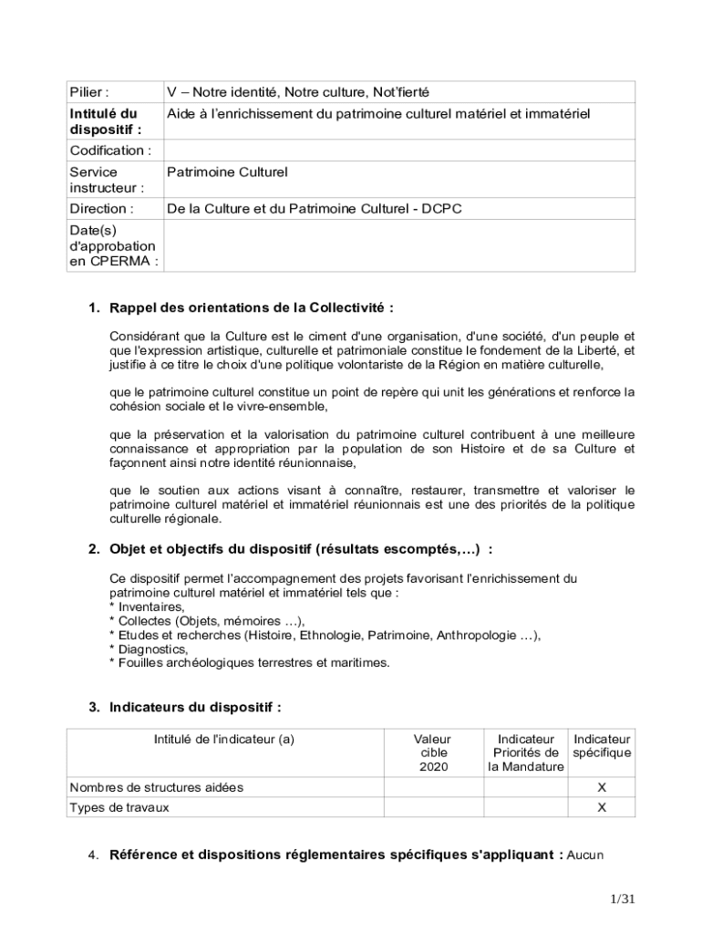 disposition :Aide lenrichissement Du patrimony cultural material et immatrielCodification :