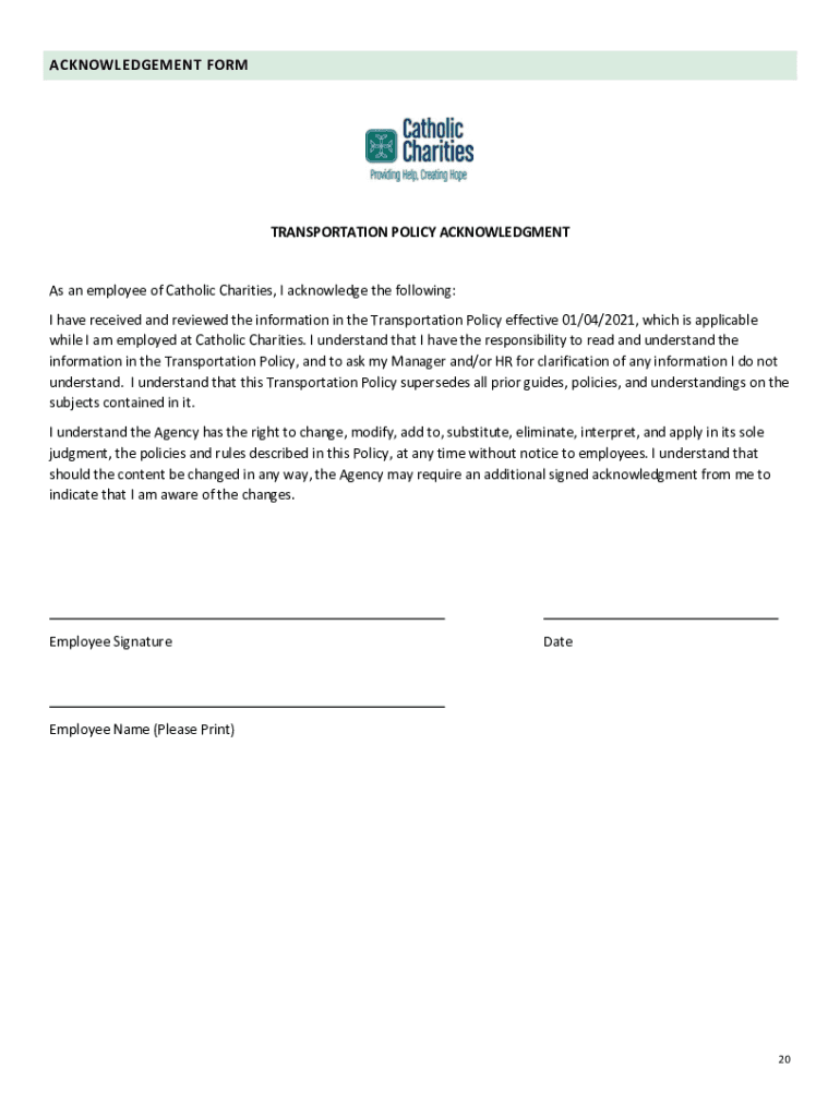 Employees, contractors, or anyone using the organization's transportation services may be required to file the acknowledgement form transportation policy.