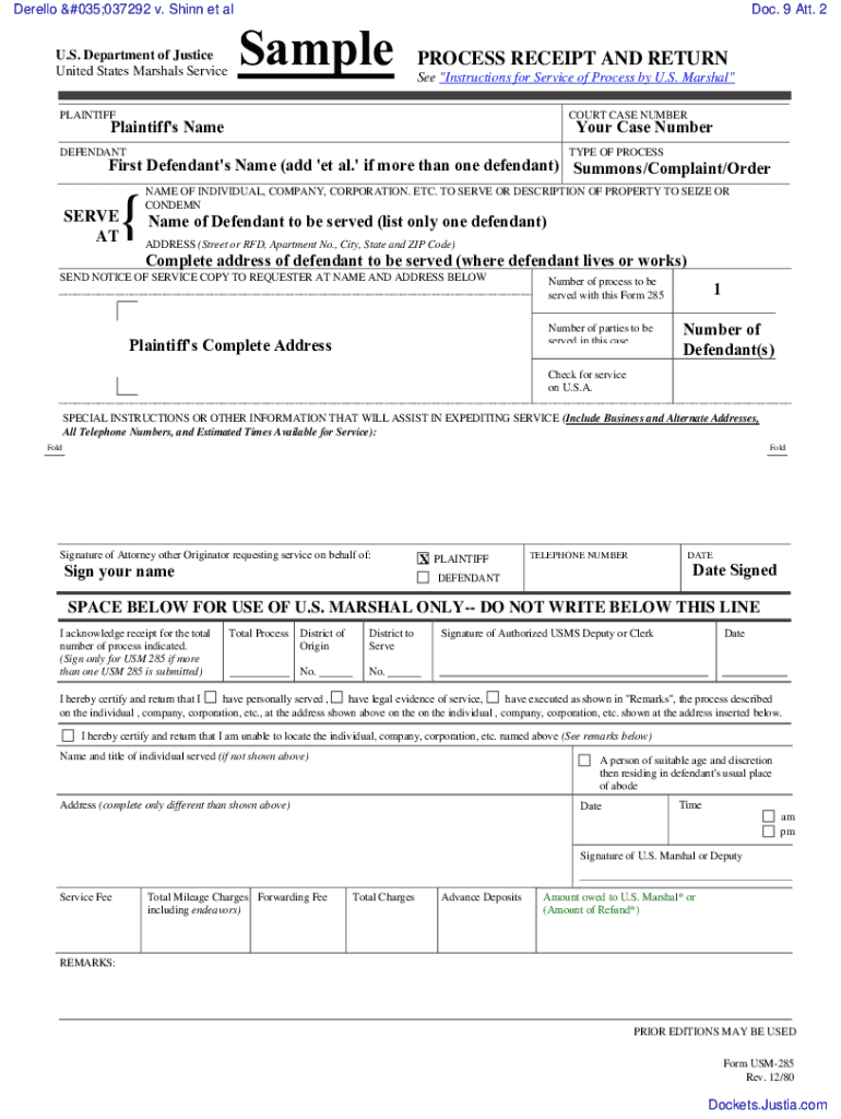 Carlo #037292 v. Shin net all. U.S. Department of Justice United States Marshals ServiceSampleDoc. 9 ATT. 2PROCESS RECEIPT AND RETURN See \'Instructions for Service of Process by U.S. Marshal\'PLAINTIFFCOURT
