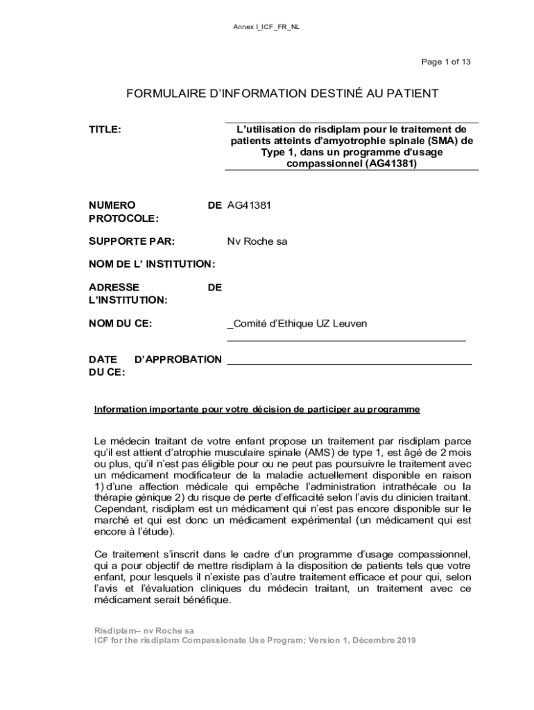 Annex I_ICF_FR_NLPage 1 of 13FORMULAIRE INFORMATION DESTINY AU PATIENT Utilization de risdiplam pour LE treatment DE patients attacks amyotrophic spinal (SMA) DE Type 1, days UN program compassion
