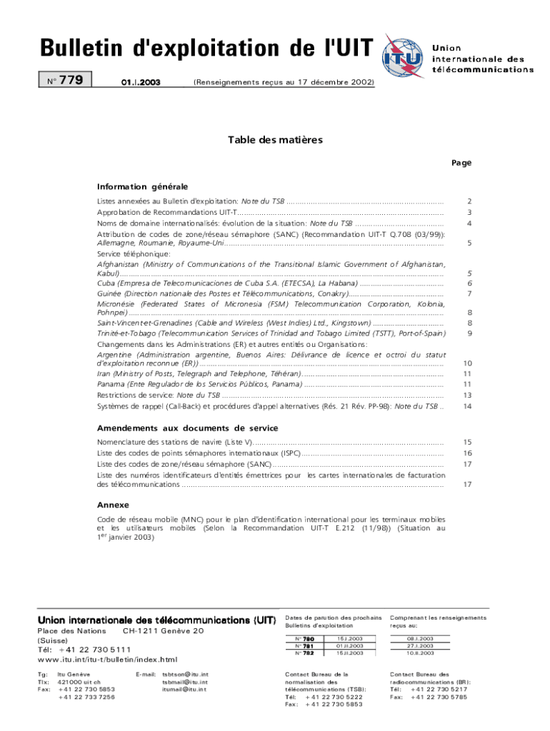 Bulletin d\'exploitation de l\'UIT No77901. I.2003U NI on in the RNA t ion ale DES t LC on m un ICCAT c a t icons ONS on mun(Restatements Zeus AU 17 December 2002)Table DES matures Page Information