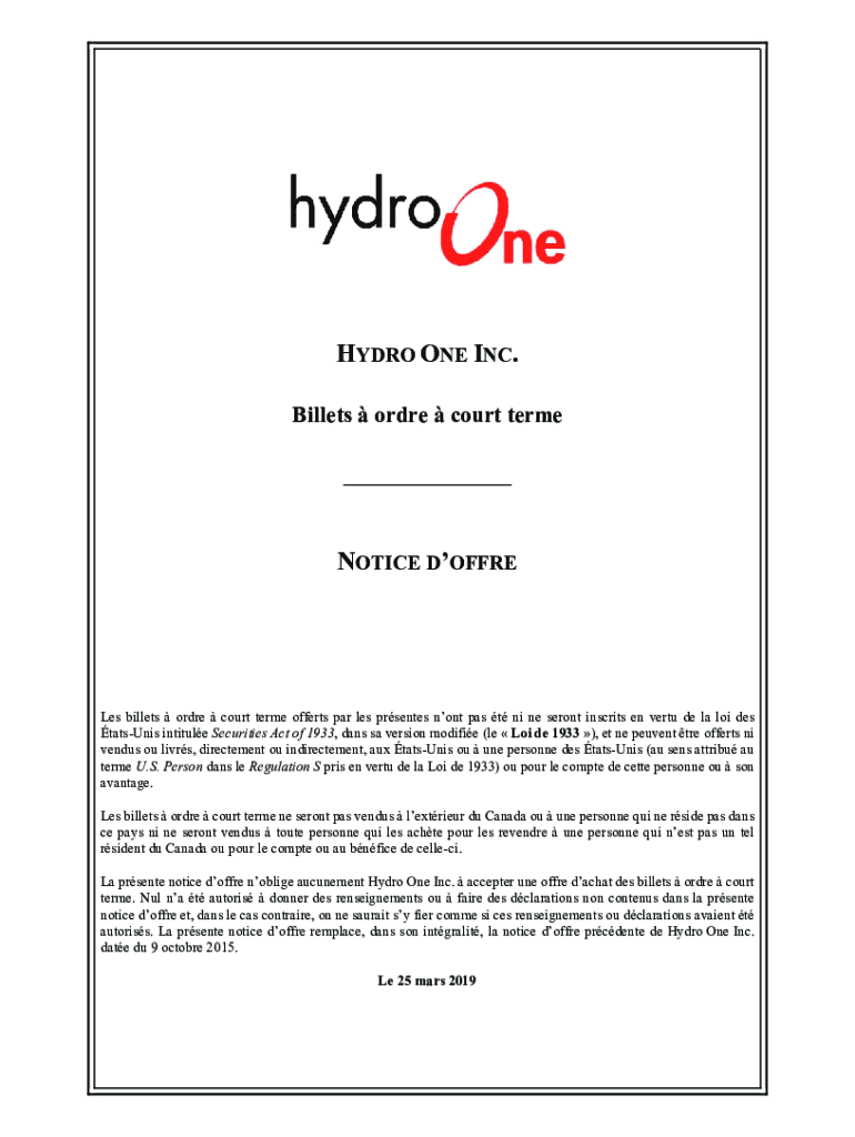 HYDRO ONE INC. Billets order court term ___NOTICE Coffees billets order court term offers par LES presented not pas t nine second inserts en vert DE la loi des Tunis institute Securities Act of 1933,