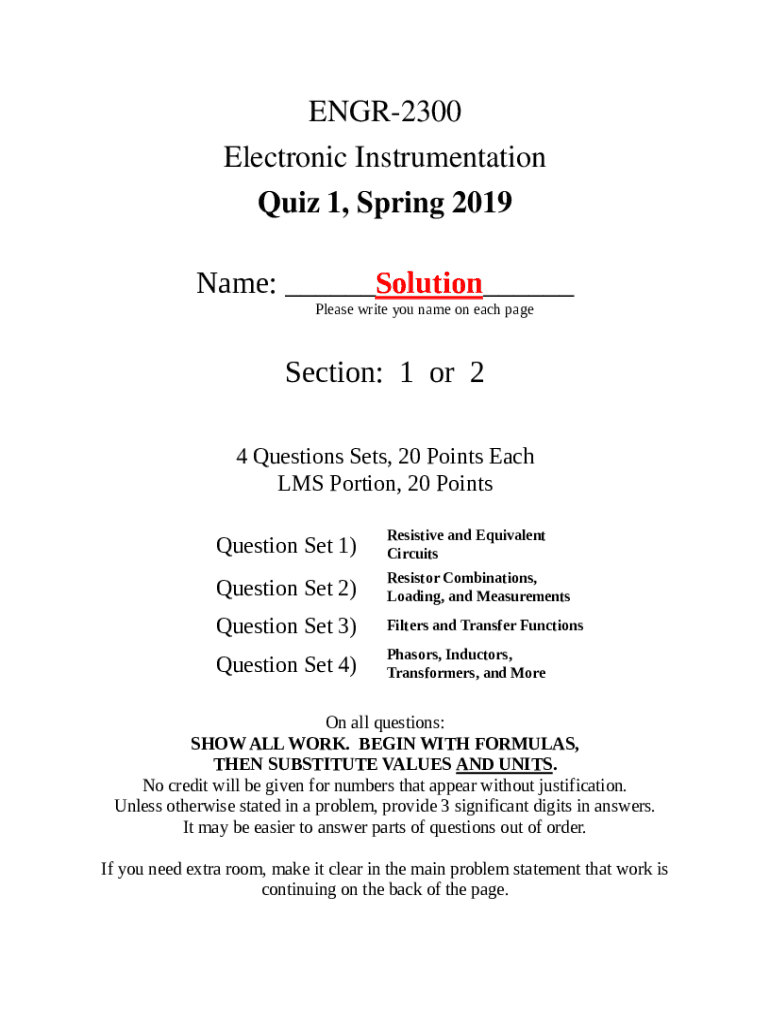 ENGR2300 Electronic Instrumentation Quiz 1, Spring 2019 Name: ___Solution___ Please write you name on each resection: 1 or 2 4 Questions Sets, 20 Points Each LMS Portion, 20 Points Question Set 1)Resistive