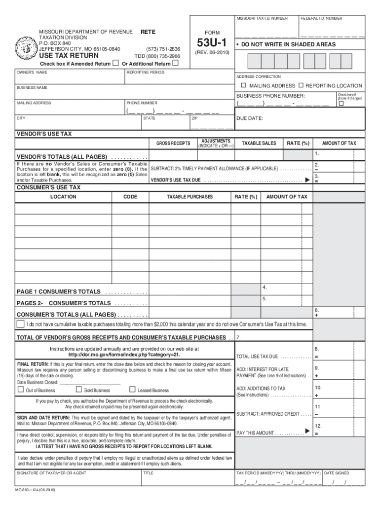 Reset Footprint Form MISSOURI TAX I.D. NUMBERMISSOURI DEPARTMENT OF REVENUE TAXATION DIVISION P.O. BOX 840 JEFFERSON CITY, MO 651050840USE TAX RETURN Check box if Amended Return OWNERS NUMERATE REFORM(573)
