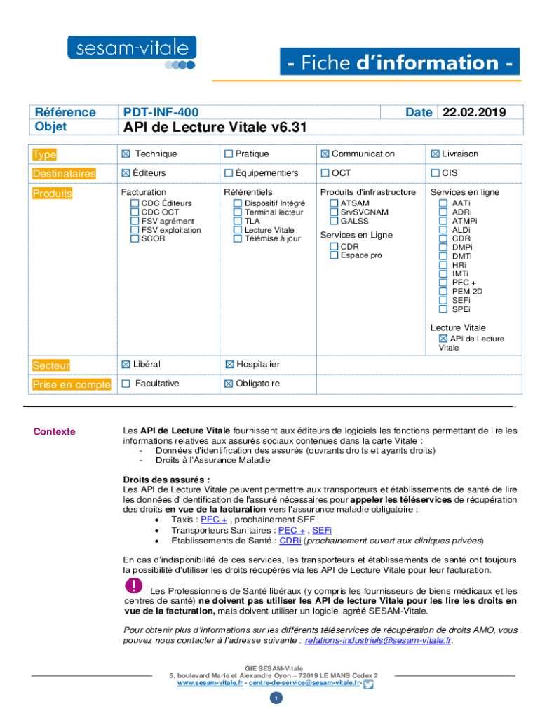 Fiche information. French ObjetPDTINF400Date 22.02.2019API de Lecture Vital v6.31TypeTechniquePratiqueCommunicationLivraisonDestinatairesditeursquipementiersOCTCISProduitsFacturationProduits dinfrastructureRfrentielsCDC