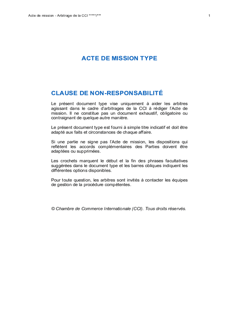 Acte de mission Arbitrage de la CCI *****/***ACTE DE MISSION TYPECAST DE NONRESPONSABILIT Le present document type vise uniqueness aider LES arbiters pissant days LE cadre arbitrages DE la CCI river