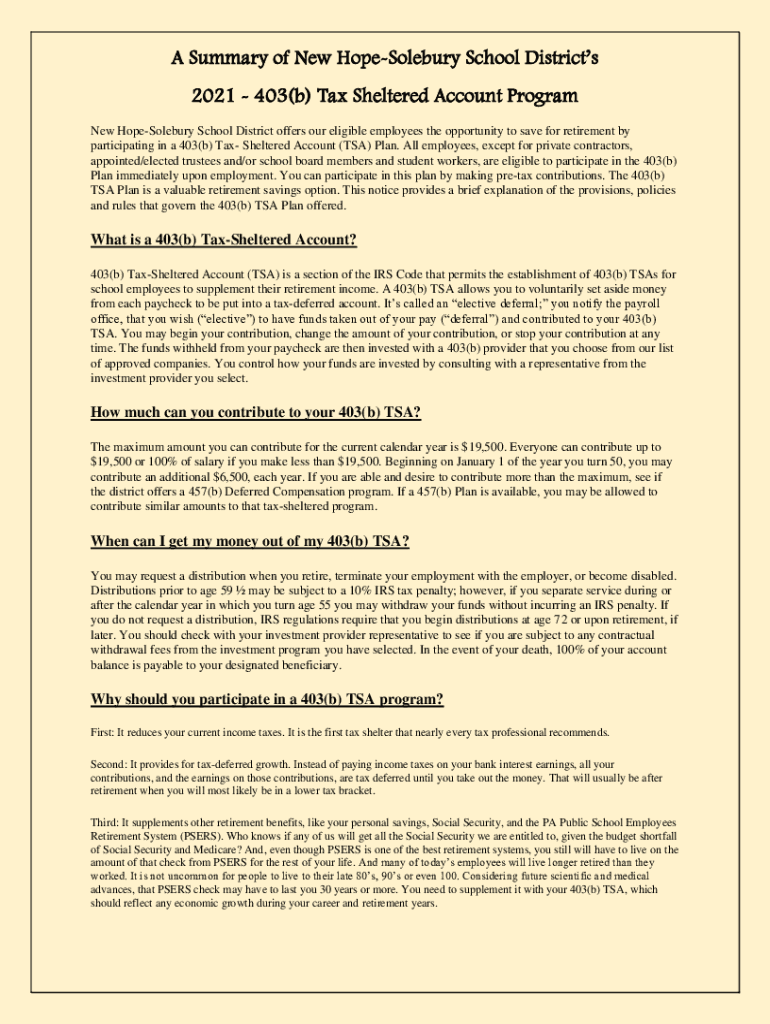 A Summary of New HopeSolebury School Districts 2021 403(b) Tax Sheltered Account Program New HopeSolebury School District offers our eligible employees the opportunity to save for retirement by participating