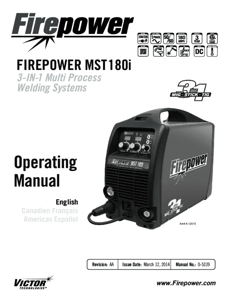 FIREPOWER MST 180i 3IN1 Multi Process Welding SystemsOperating Manual English Canadian Francis Americas eScholar# A12515Revision: Issue Date: March 12, 2014Manual No.: 05339www. Firepower.come APPRECIATE