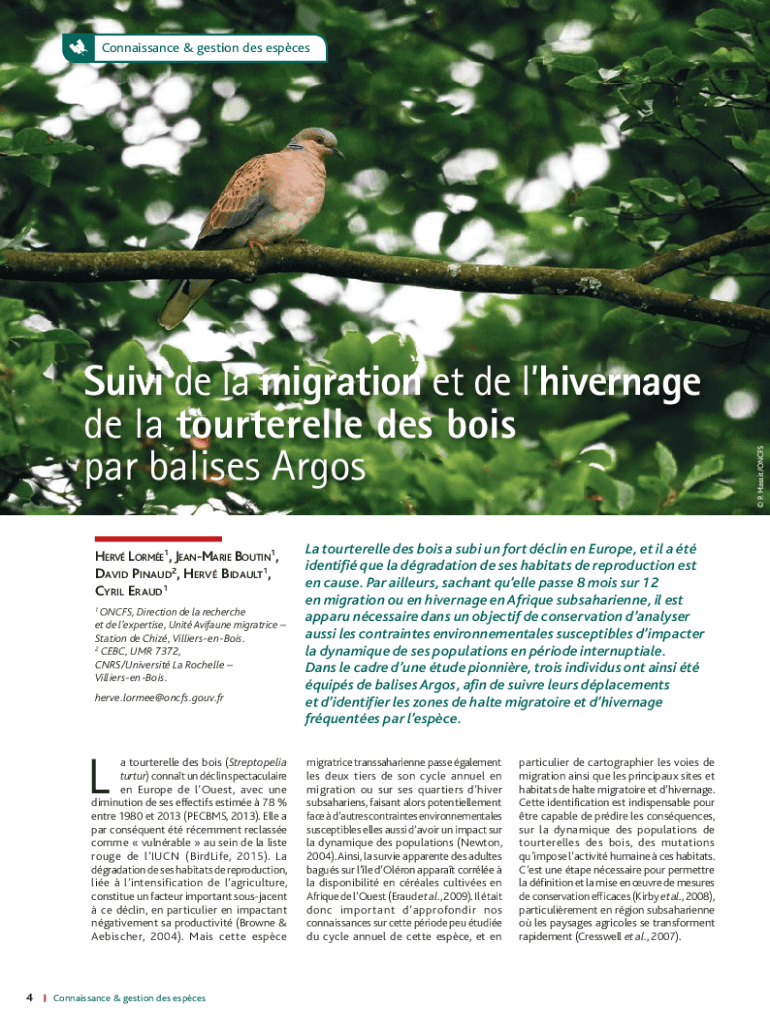 Get the free Suivi de la migration et de l'hivernage de la tourterelle des bois par ...