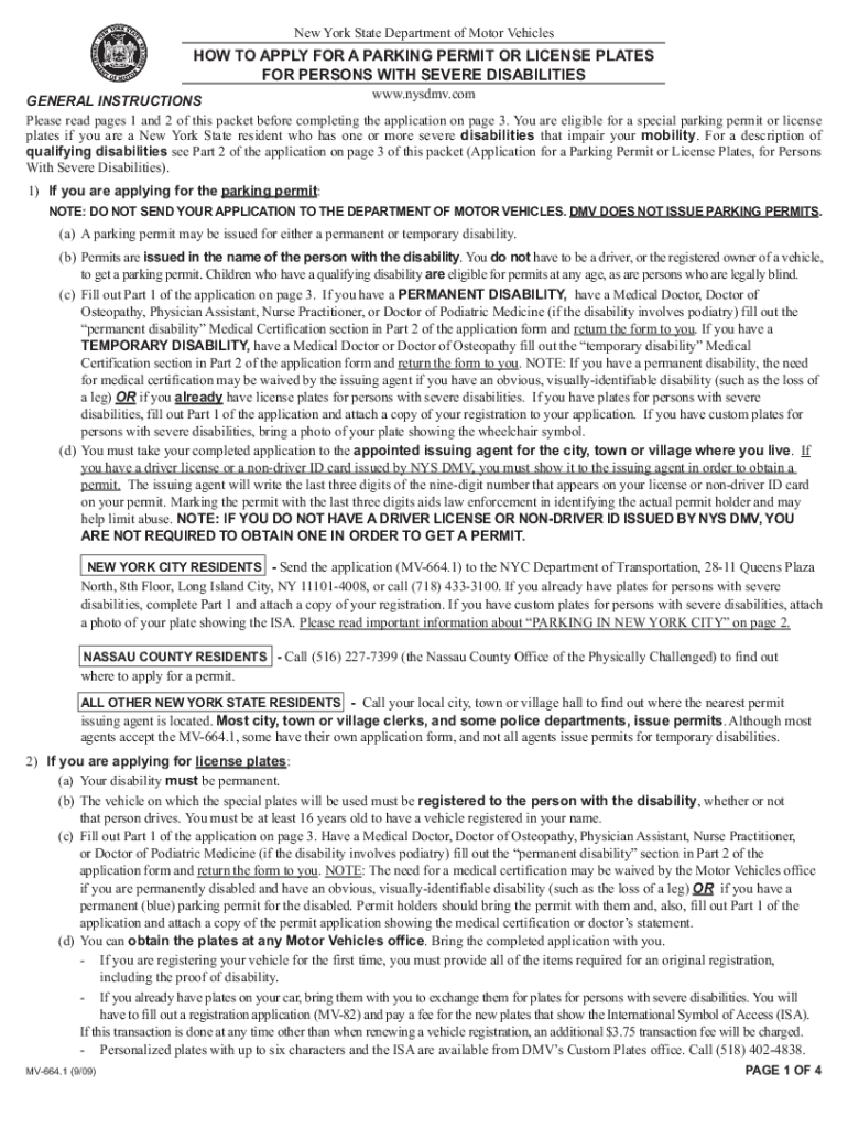 New York State Department of Motor Vehicles TO APPLY FOR A PARKING PERMIT OR LICENSE PLATES FOR PERSONS WITH SEVERE Disabilities.nysdmv.com GENERAL INSTRUCTIONS Please read pages 1 and 2 of this packet