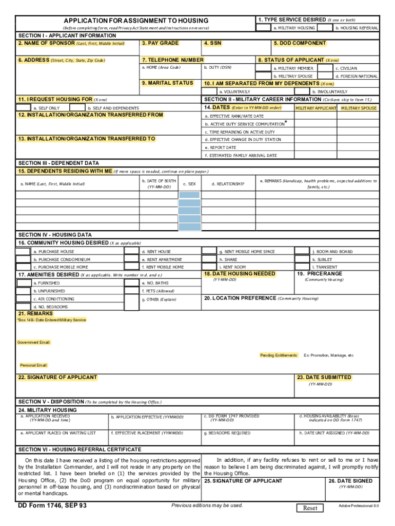 APPLICATION FOR ASSIGNMENT TO HOUSING1. TYPE SERVICE DESIRED (X one or both) a. MILITARY HOUSING(Before completing form, read Privacy Act Statement and Instructions on reverse)SECTION I APPLICANT