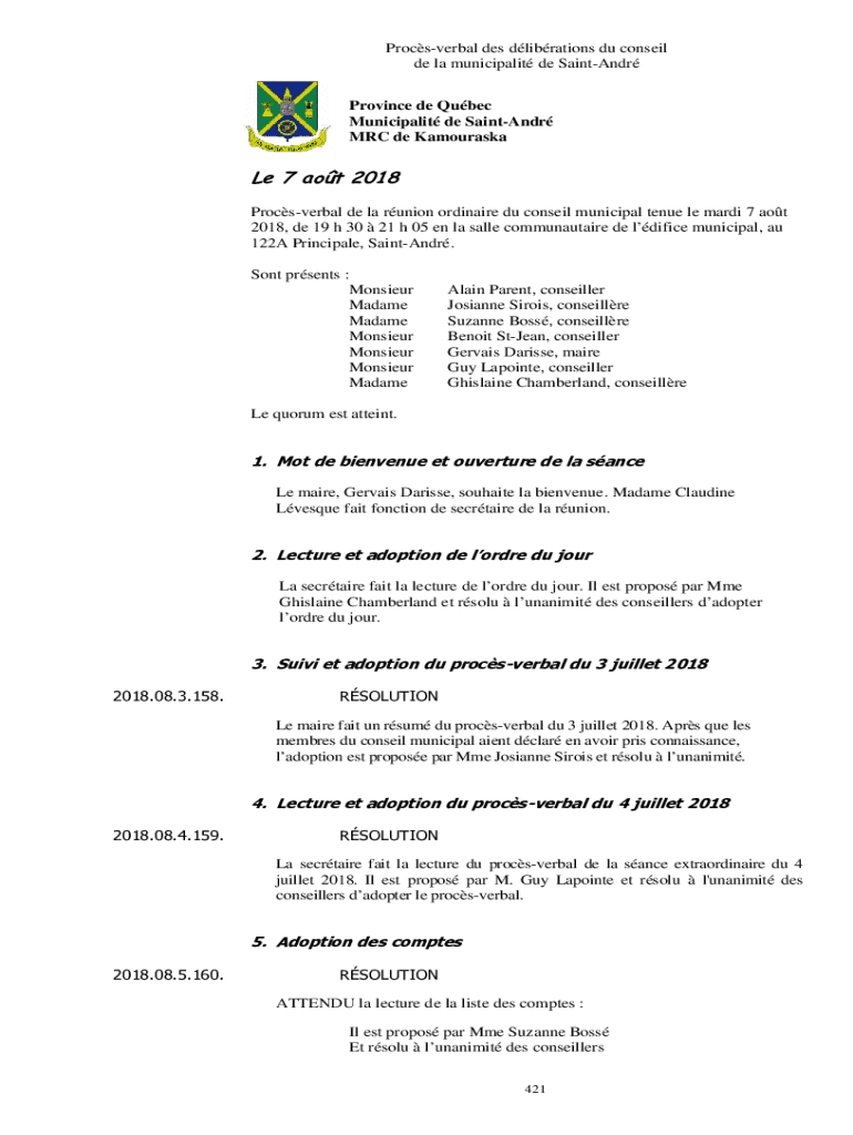 Procès-verbal DES vibrations Du Conrail de la municipality de Santander 00000000 Province de Qubec Municipality de SaintAndr MRC de KamouraskaLe 7 AOT 2018 Procès-verbal de la Union ordinary Du