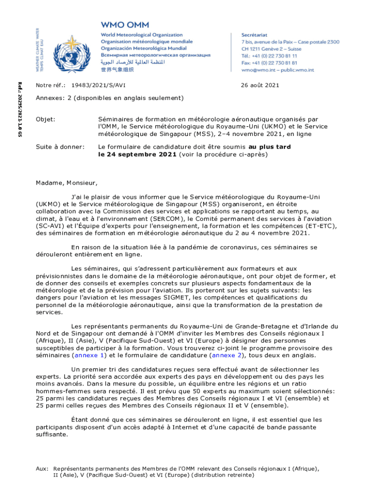 Note RF.: 19483/2021/S/AVI26 AOT 2021Annexes: 2 (disposables en angles element) Object:Seminaries DE formation en meteorologic aronautique organism par l\'OMM, LE Service mtorologique Du RoyaumeUni