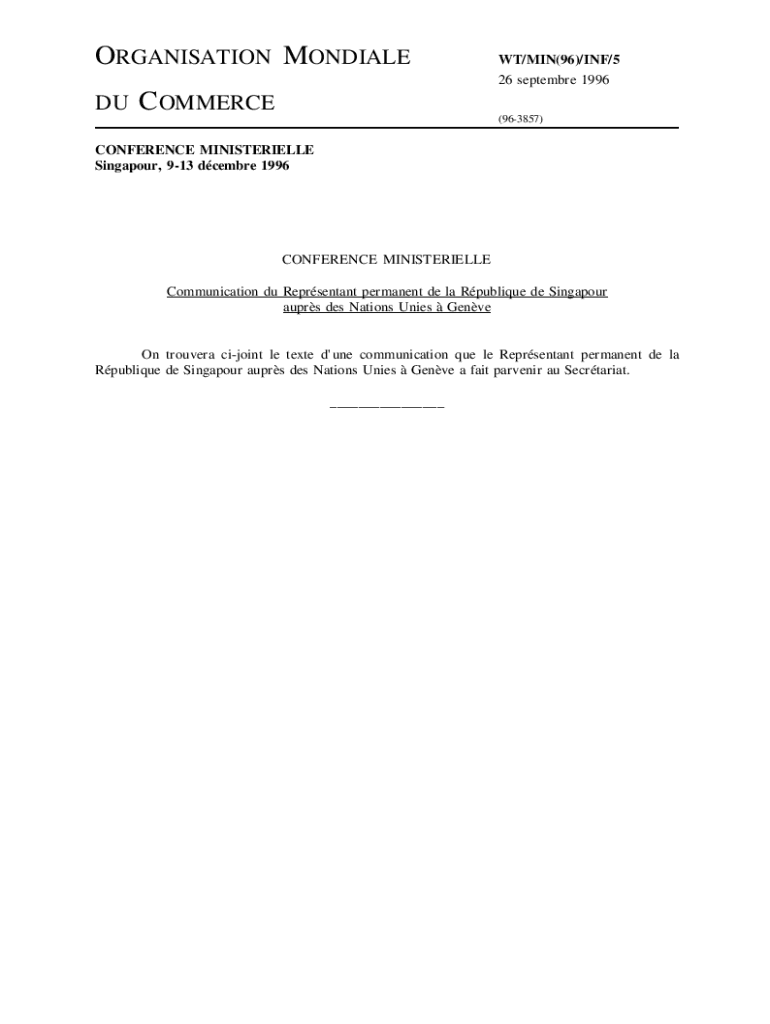 Organization MONDALE DUCOMMERCEWT/MIN(96)/INF/5 26 September 1996 (963857)CONFERENCE MINISTERIAL Singapore, 913 December 1996CONFERENCE MINISTERIAL Communication Du Repentant permanent DE la Oblique