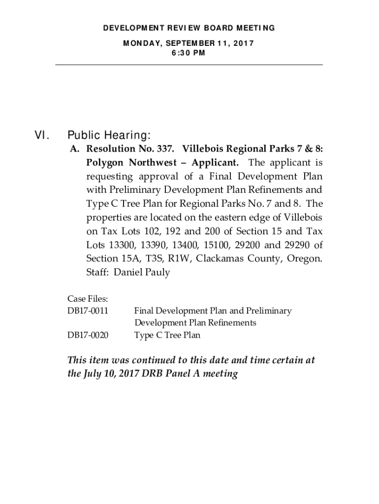 DEVELOPMENT REVIEW BOARD MEETING MONDAY, SEPTEMBER 11, 2017 6:30 PM ___VI. Public Hearing:A. Resolution No. 337. Illinois Regional Parks 7 & 8: Polygon Northwest Applicant. The applicant is requesting