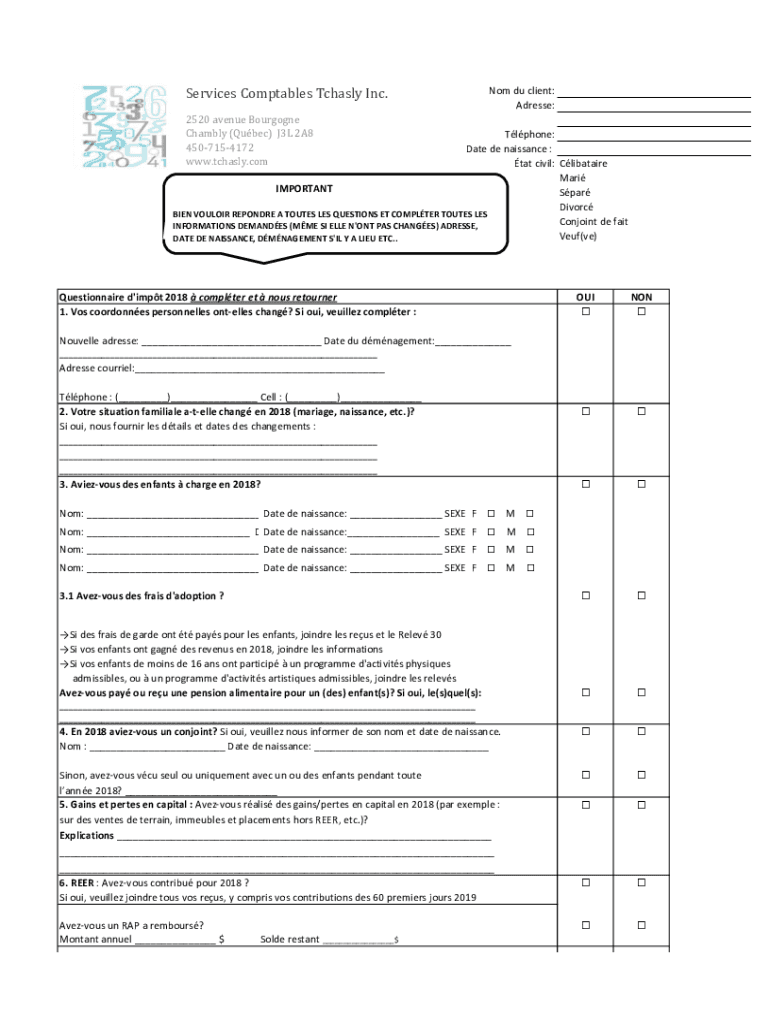 Services Comp tables Totally Inc. Not Du client: Address:2520 avenue Burgoyne Chamber (Quebec) J3L 2A8 4507154172 www.tchasly.comTlphone: Date de Renaissance : that civil: Clibataire Mari IMPORTANT