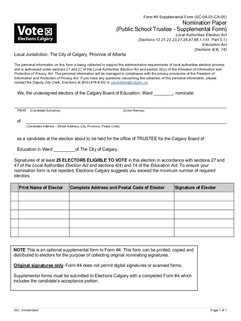 Form #4 Supplemental Form (EC0401CA05)Nomination Paper (Public School Trustee Supplemental Form)Local Jurisdiction: The City of Calgary, Province of AlbertaLocal Authorities Election Act (Sections